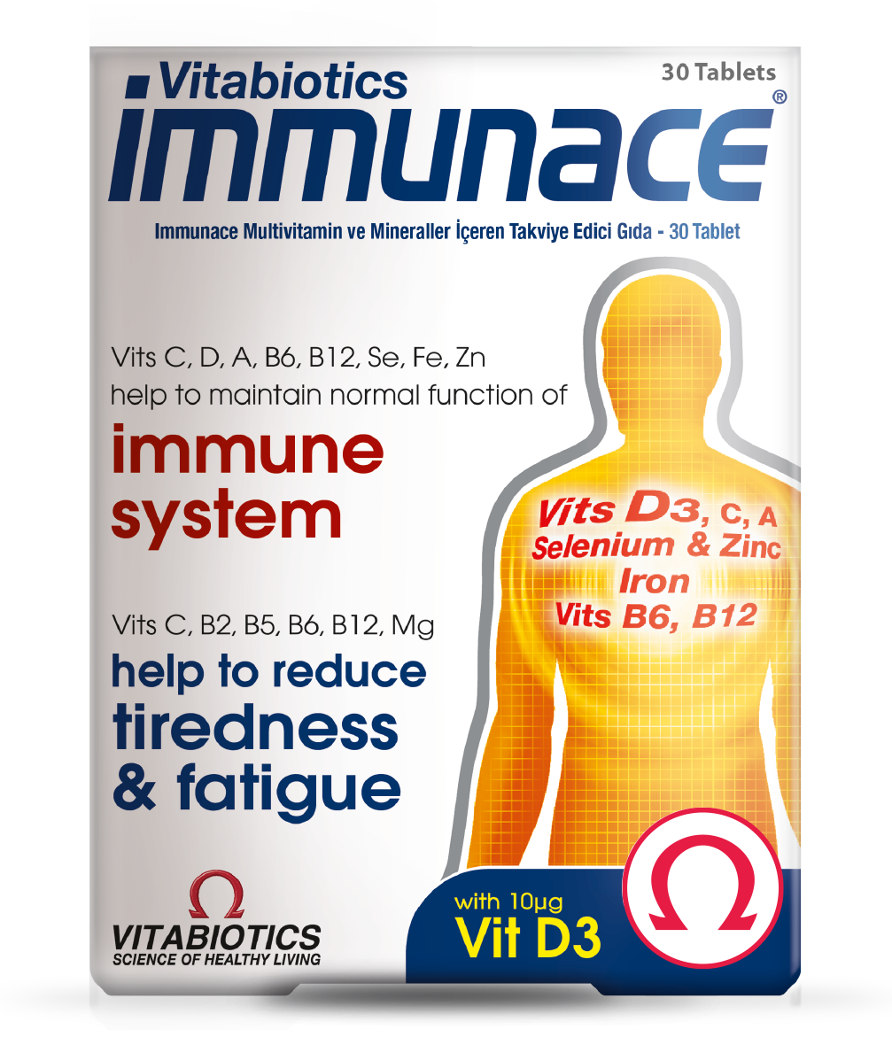 İçerisindeki C, D, A, B6, B12 vitaminleri, Selenyum, Demir ve Bakır bağışıklık sisteminin normal fonksiyonuna katkıda bulunur. Immunace®’in vitamin, mineral, antioksidanlar ve aminoasitler içeren özel formülü Vitabiotics’in beslenme uzmanlarının uluslararası beslenme uzmanlarıyla iş birliği sonucu geliştirilmiştir1.