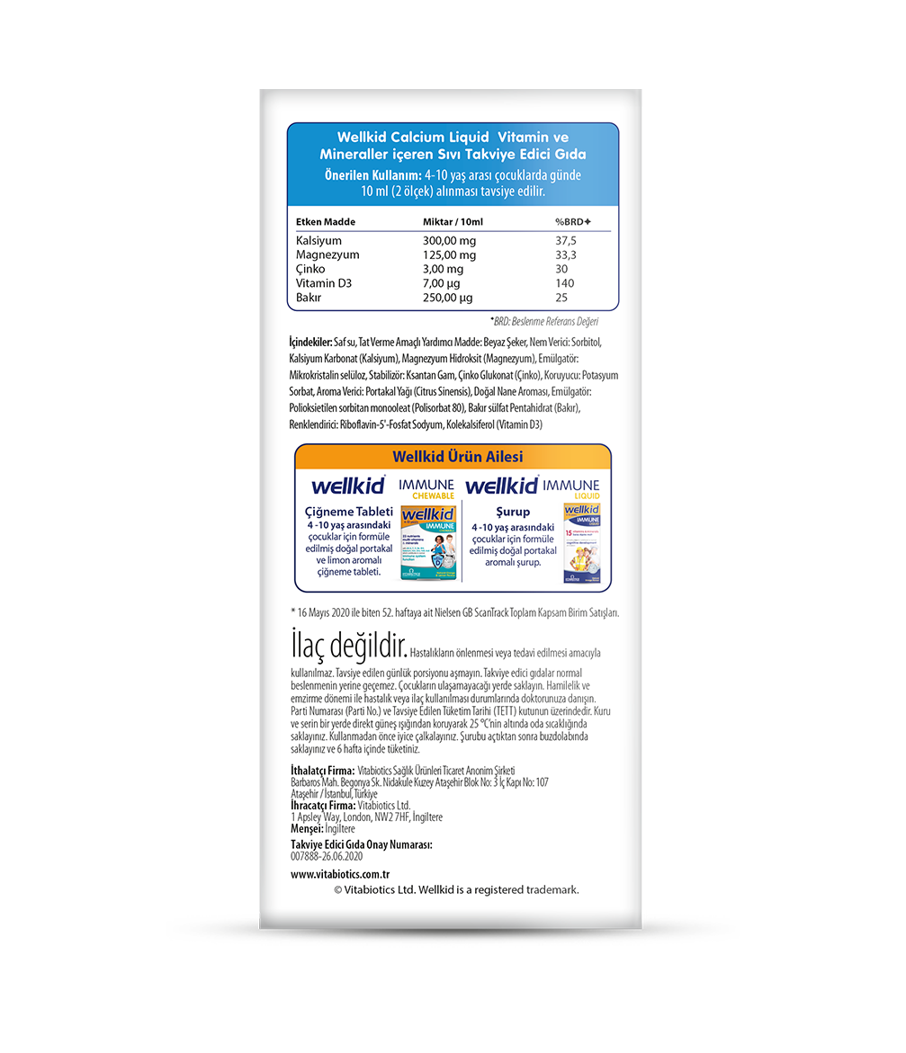 Wellkid® Calcium Liquid bilimsel olarak formüle edilmiş ve uzmanlar tarafından geliştirilmiştir. Her bileşen araştırmalara dayanarak formüle dahil edilmiştir. Kalsiyum ve D vitamininin çocuklarda normal büyüme ve kemik gelişiminin korunmasına katkıda bulunduğu bilimsel olarak kanıtlanmıştır. Wellkid Calcium Liquid 7μg D vitamini içerir.