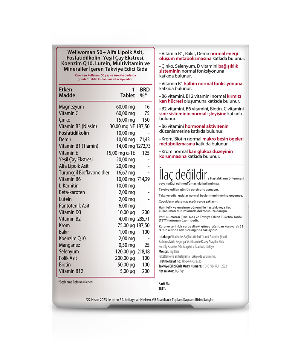 Wellwoman 50+, kadınların yaş aldıkça ihtiyaç duyabilecekleri 26’dan fazla vitamin, mineral ve özel besin maddesi içeren formülü ile iyilik hallerini korur ve günlük performanslarını artırmalarına destek sağlar.