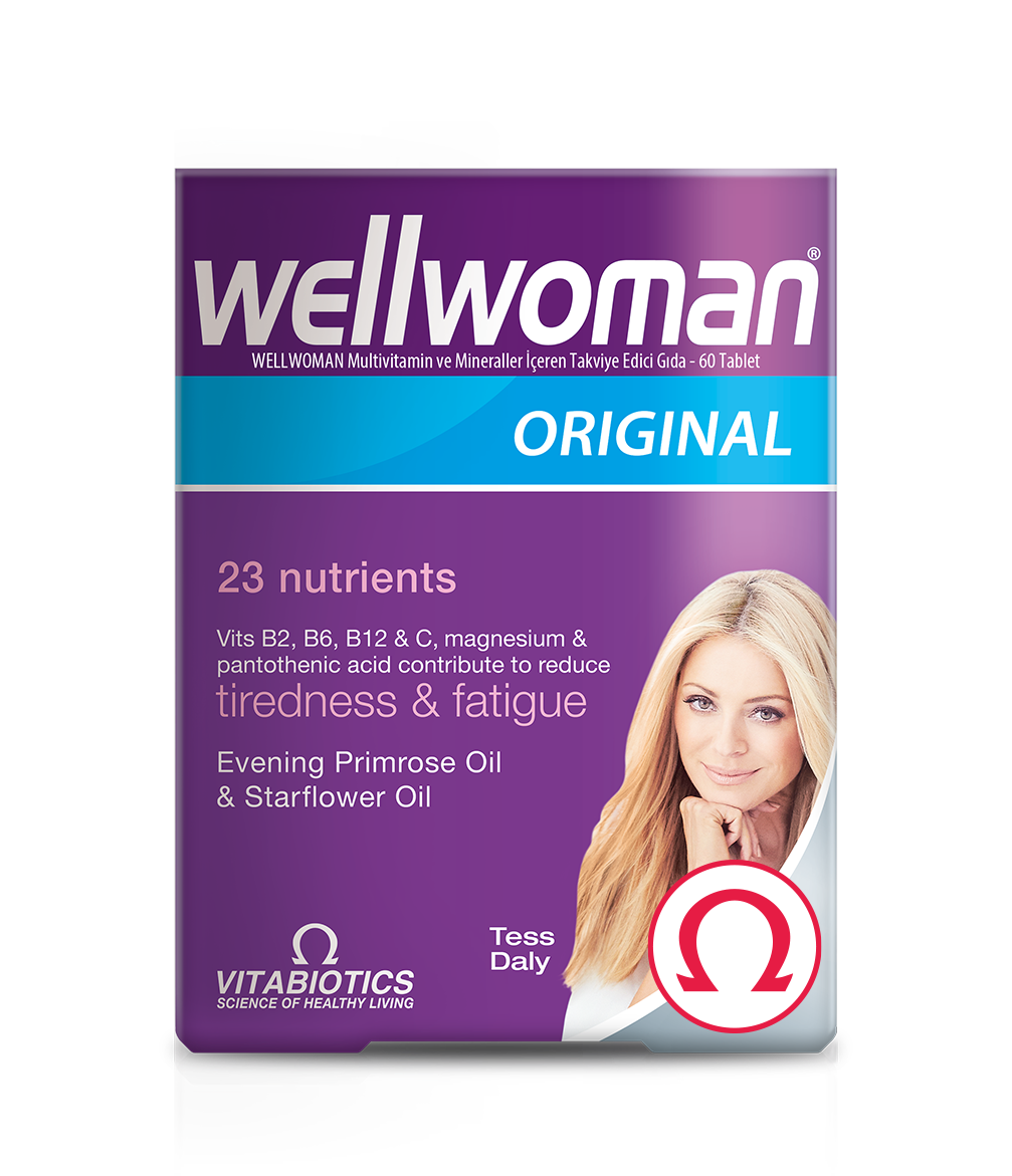 Wellwoman® Original formülasyonu, yorgunluk ve bitkinliğin azalmasına katkıda bulunan B6 vitamini sağlamaktadır3. Ayrıca Wellwoman® 400 mcg folik asit içermektedir1.