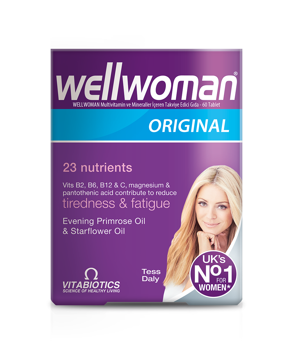 Wellwoman® Original formülasyonu, yorgunluk ve bitkinliğin azalmasına katkıda bulunan B6 vitamini sağlamaktadır3. Ayrıca Wellwoman® 400 mcg folik asit içermektedir1.